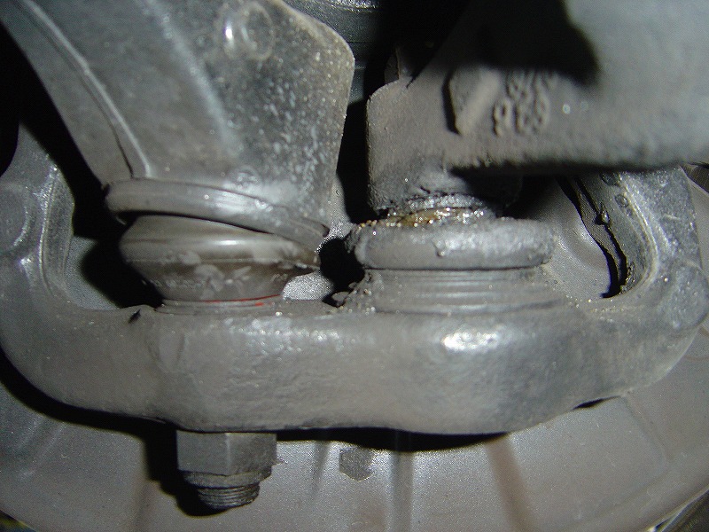 リフトアップして確認、予感は的中 ブッシュ等に亀裂 ボールジョイントのガタ